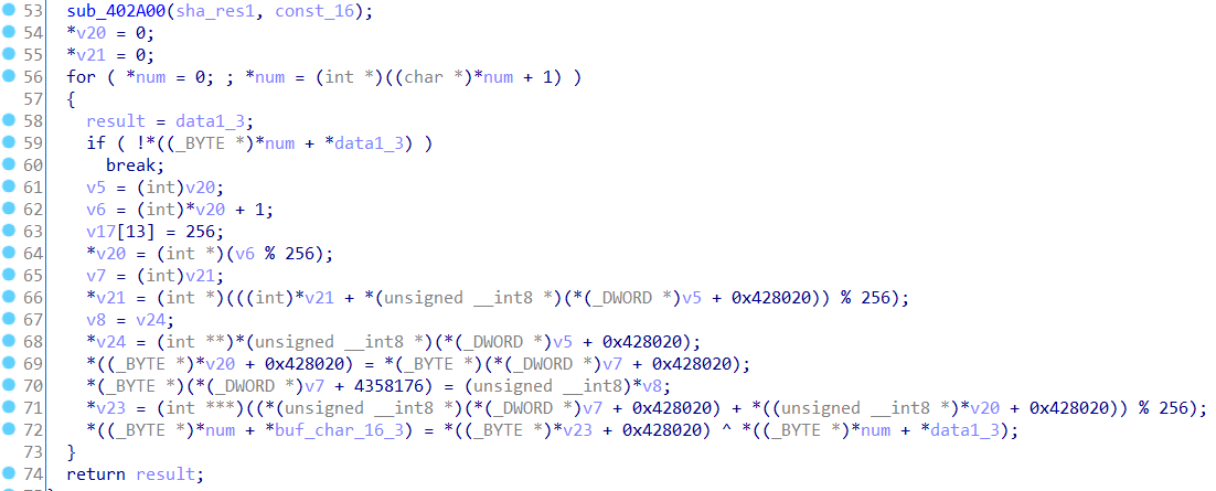 跟进分析。可以发现for循环次数就是data1的长度16,且有%256操作,可以看出应该是对data1进行rc4加密处理。则前面的sub_402A00函数应该就是生成密钥流,且储存在地址0x428020。
