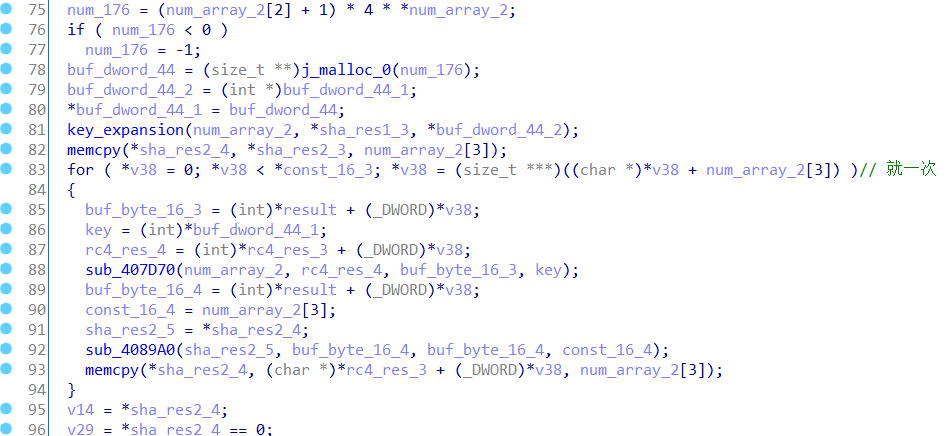 而后调用两个函数,跟进sub_407D70,我们可以发现具体使用的是AES加密的逆S盒(inverse S-box),且之后的函数sub_4089A0进行异或操作,通过逆S盒以及最后先处理再异或的顺序,可以判断出这里进行的是AES的CBC模式解密,key就是sha_res1,iv就是异或函数的参数sha_res2。