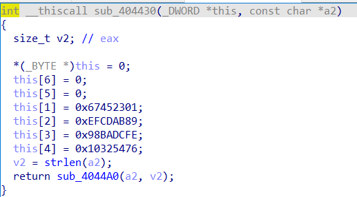 在函数sub_404430中发现了md5加密算法的4个链接变量的数据初始化,则推测这里是对字符串admin进行了md5加密,