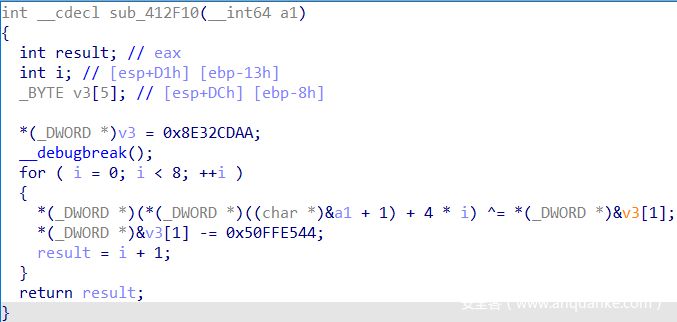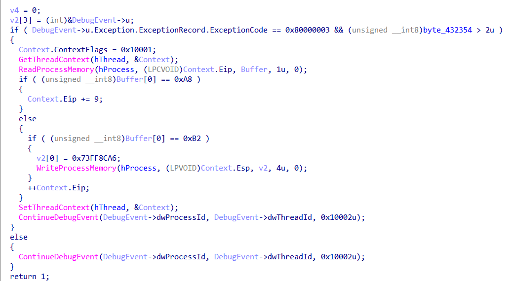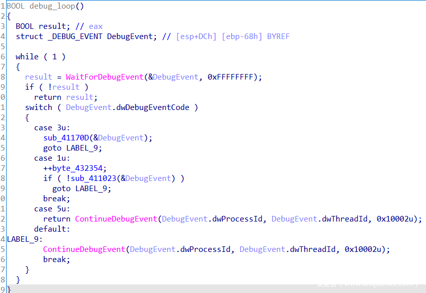 其中一个变量byte_432354用于计数,但不是很清楚具体的作用。还是看关键函数sub_413950。将参数类型改为struct _DEBUG_EVENT *后进行分析。