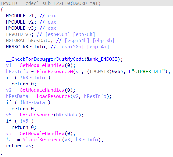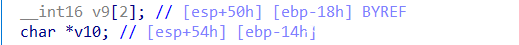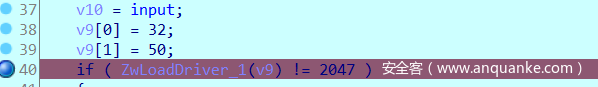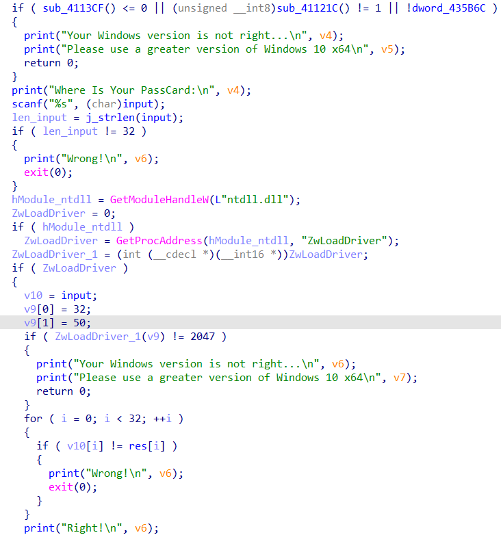 之后将input转储到v10,并对v9进行赋值,查看变量声明处可以知道v9、v10是连续的空间,相当于在input前加添加了两个16比特的值。并将其作为参数,调用ZwLoadDriver函数,并对返回值检测。最后将v10与已知数据进行check,一致即可。