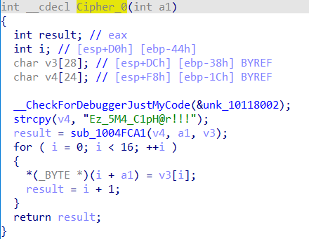 而后的sub_408B70函数参数涉及到了之前数据rc4加密后的结果,以及前面经过sha256加密异或得到的固定数据。返回值就是我们这整个encrypt函数的加密结果。应该是对rc4加密结果又做了处理。通过findcrypt插件我们已经可以发现这个函数中引用了AES的S盒,猜测是将rc4加密结果(16字节)作为明文,sha_res1(16字节)和sha_res2(16字节)分别作为密钥和初始化向量,进行AES相关操作。