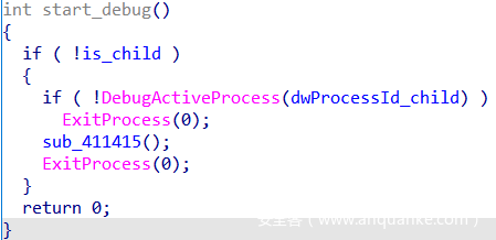 - 能够控制子进程。调试器-被调试器者关系中,调试器具有很大权限,可以处理被调试进程的异常、控制代码执行流程。使得代码调试变得十分艰难。这也是这个程序所用到的,子进程使用int 3产生异常让父进程处理,从而破坏代码逻辑,且难以调试。