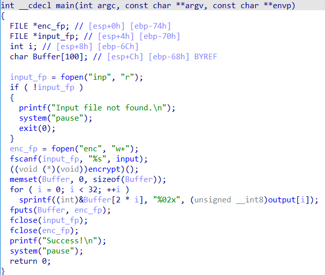 猜测程序先将输入input通过encrypt函数加密,结果存储到output中,在后面通过memcmp函数进行check,而比较的另一项res可能与输入无关,是一个定值。