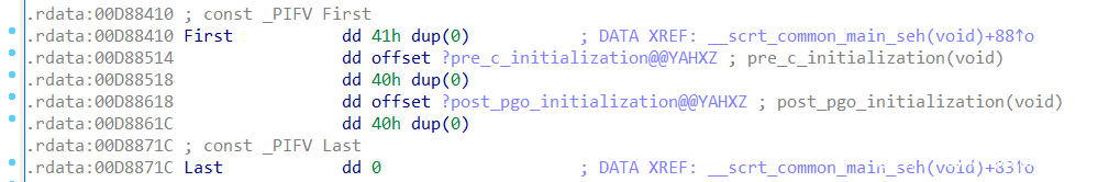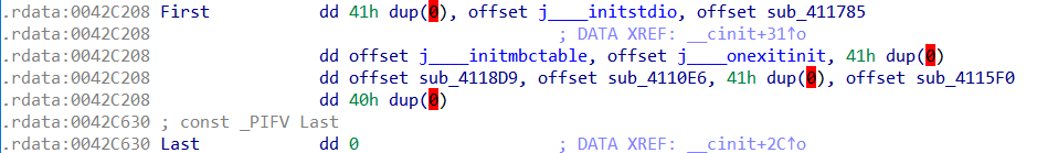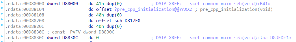 查看这些dword数据,可以发现都是bss段的数据,即存放程序中未初始化的全局变量和静态变量的一块内存区域,在程序执行之前会自动清0。查看交叉引用可以发现并没有再进行赋值,则这些数据全为0。