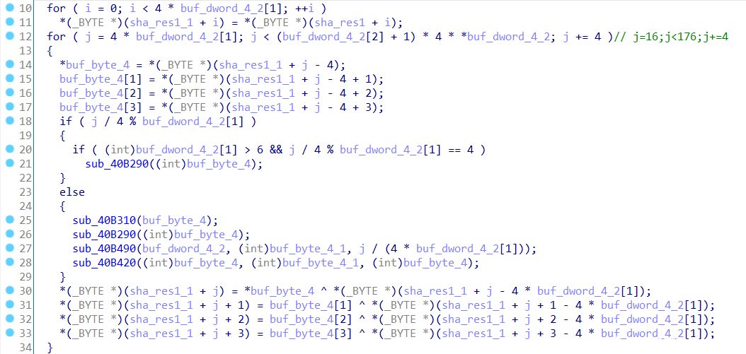 key_expansion函数的参数是sha_res1和176个字节的空间,函数中循环根据是否为4的倍数进行不同操作,且用到了AES的S盒,则这个函数就是进行密钥扩展。可知参数sha_res1即为密钥。