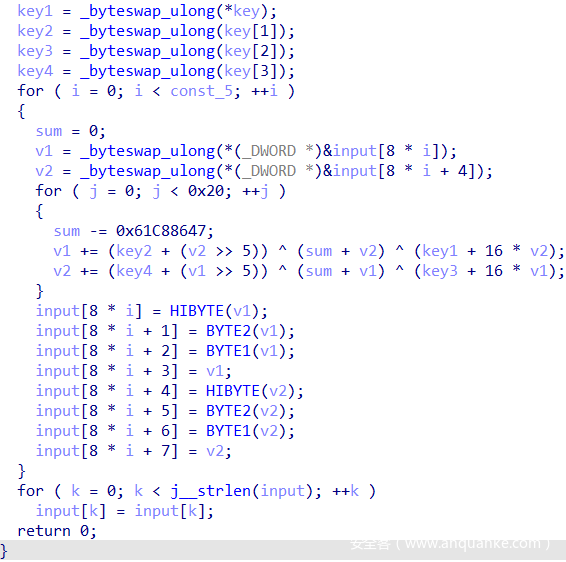 可以看到tea加密常数,观察可以发现是xtea加密。密钥就是前面生成的data数组的前四个数据,_byteswap_ulong就是将数据又由char类型又转换为int类型。
