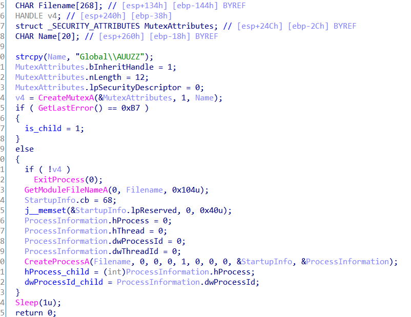 - 防止代码调试。因子进程运行实际的源代码且已经处于调试之中,原则上就无法再使用其他调试器进行附加操作了。如该程序如果在main函数中直接下断点,会发现根本断不下来。因为这时子进程执行的代码,而父进程执行的调试循环则可以断下来。