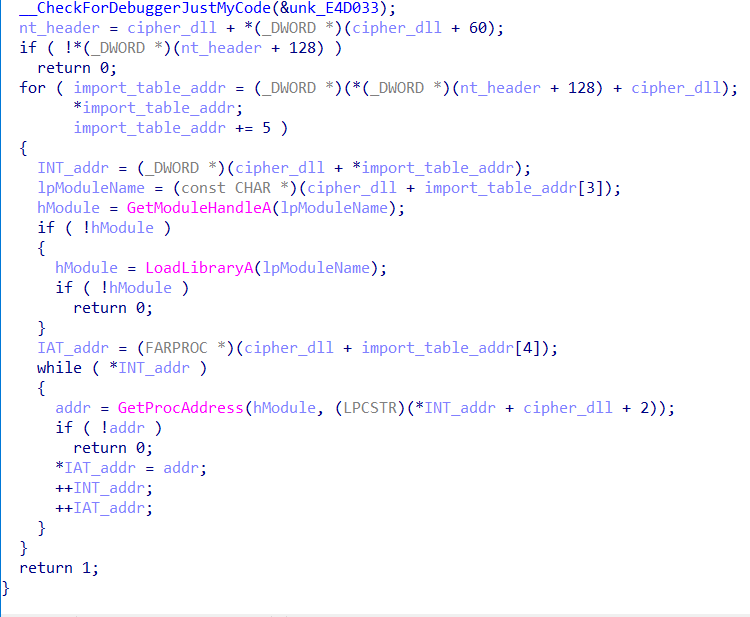 分析main函数,程序首先判断输入长度为32位,之后调用GetModuleHandleW函数获取ntdll动态链接库模块的句柄。然后调用GetProcAddress函数获取ntdll动态链接库中的导出函数ZwLoadDriver的地址。