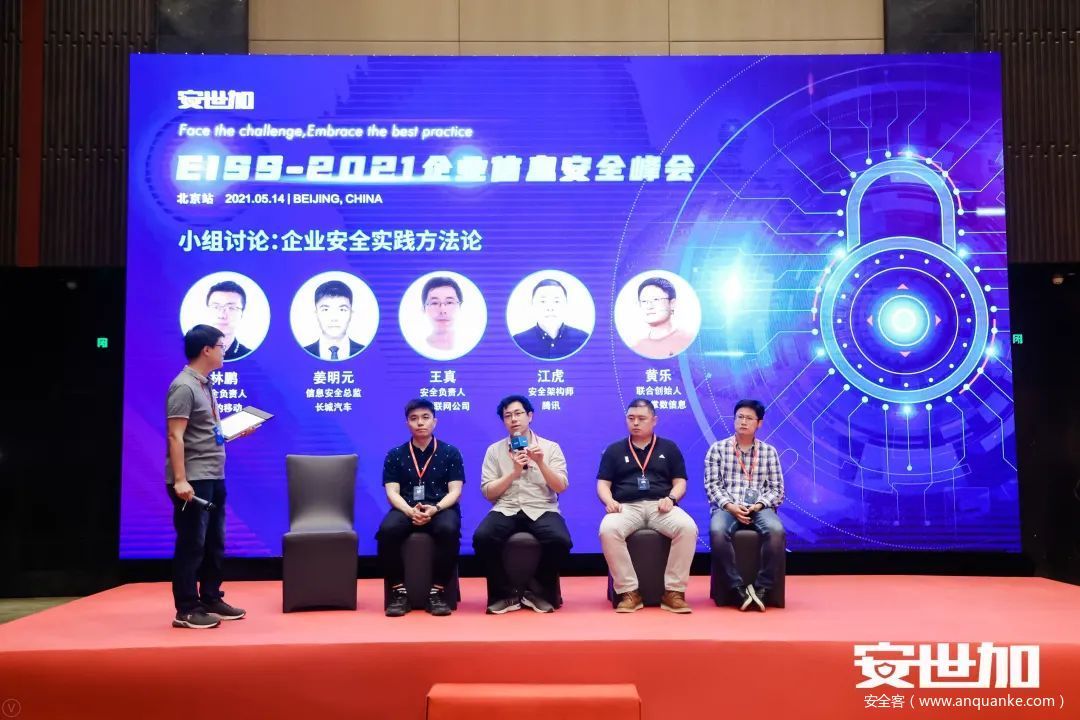 分会场一最后一个环节是由来自猎豹移动的安全负责人 林鹏、长城汽车的安全负责人 姜明元、某互联网公司的安全负责人 王真、腾讯的安全架构师 江虎、北京掌数信息的联合创始人 黄乐共同组成的小组讨论:企业安全实践方法论。