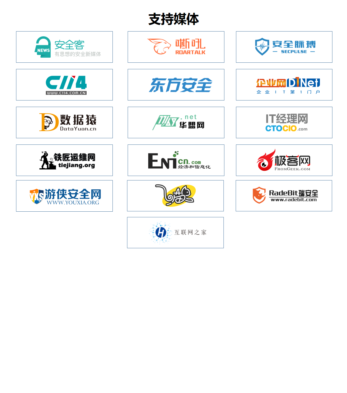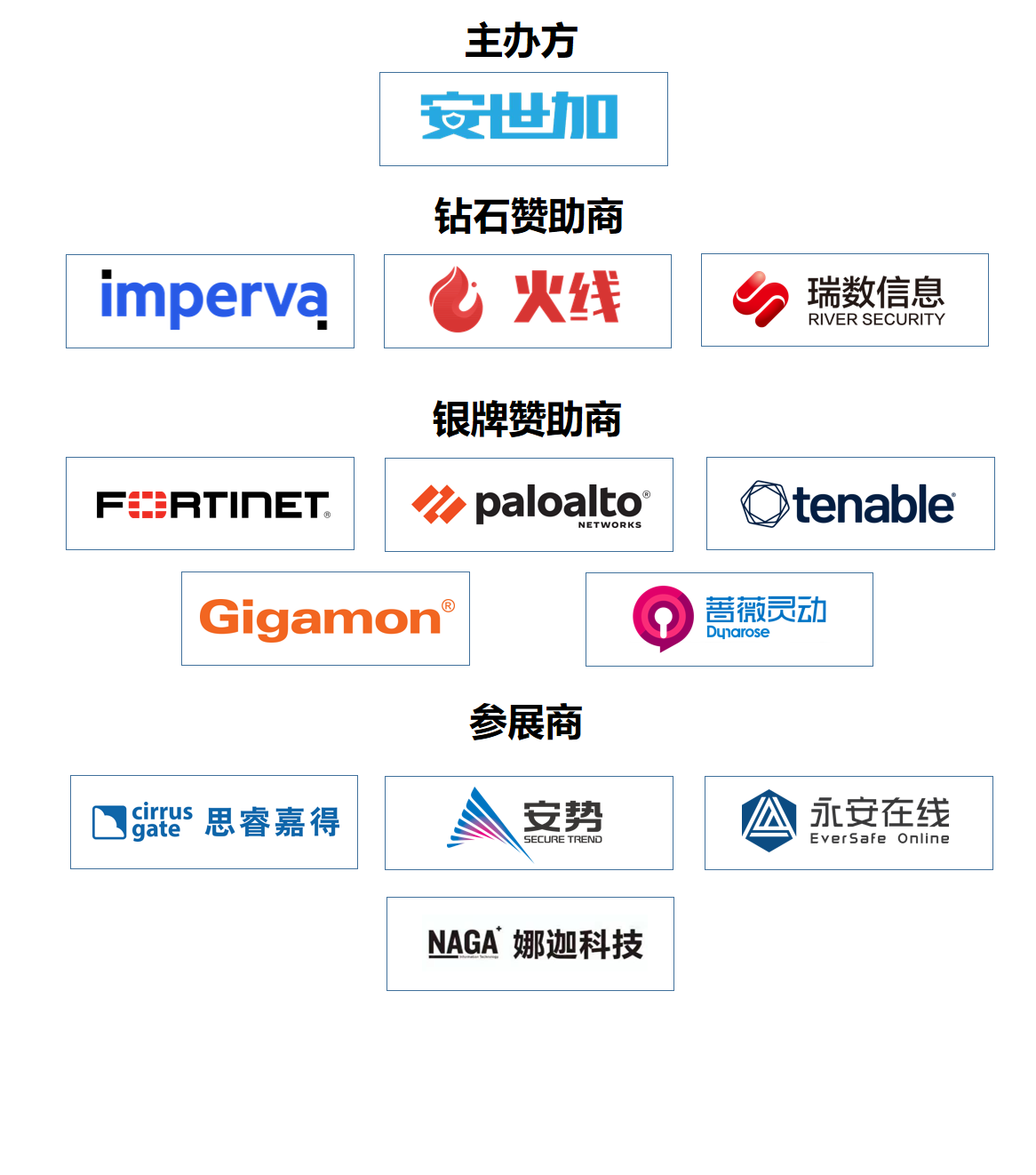 本次峰会共有Imperva、火线安全、瑞数信息、Fortinet、Palo Alto Networks、Tenable、Gigamon、蔷薇灵动、思睿嘉得、安势、永安在线及娜迦科技,共12家企业赞助,并获得多达52家单位和30家安全媒体的鼎力支持。