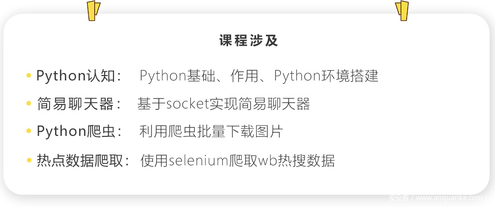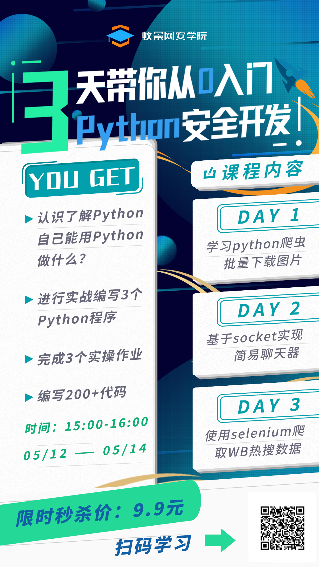 因此,我给大家挑了一门我详细了解过的课程,蚁景网安学院出品的《3天 · 带你从0入门Python安全开发》。这门课最大的亮点就在于全程在线直播实操、边听边练、录播随时回看!