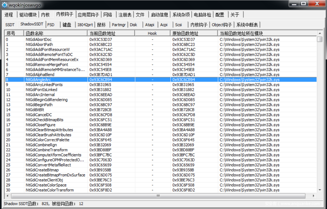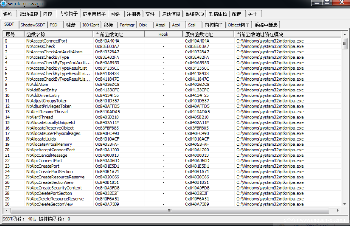 A:前者涵盖的是有关ntoskrnel.exe、ntdll.dll的内核函数,后者则包含了ntoskrnel.exe以及win32k.sys、gdi.dll、user.dll中包含的内核函数。我们打开PCHunter,查看一下两张表即一目了然。以下分别是SSDT以及SSDTshadow