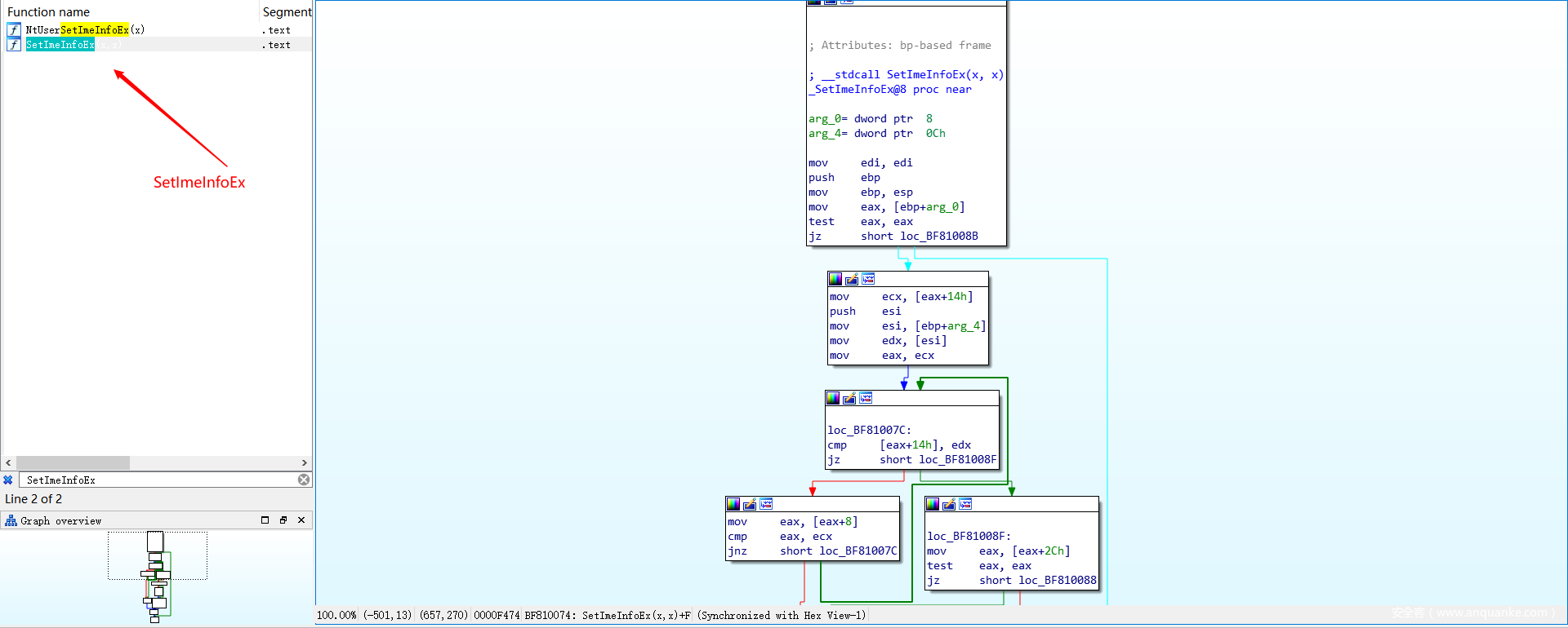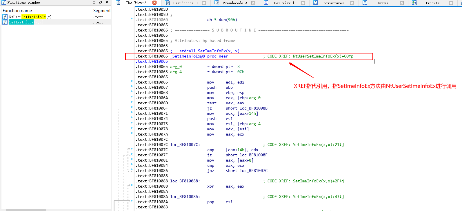 得知SetImeInfoEx方法存在漏洞,自然就要找到在何处调用了该方法,点击IDA View-A,文件查阅,通过XREF关键字可知,方法NtUserSetImeInfoEx调用了存在漏洞的SetImeInfoEx方法。