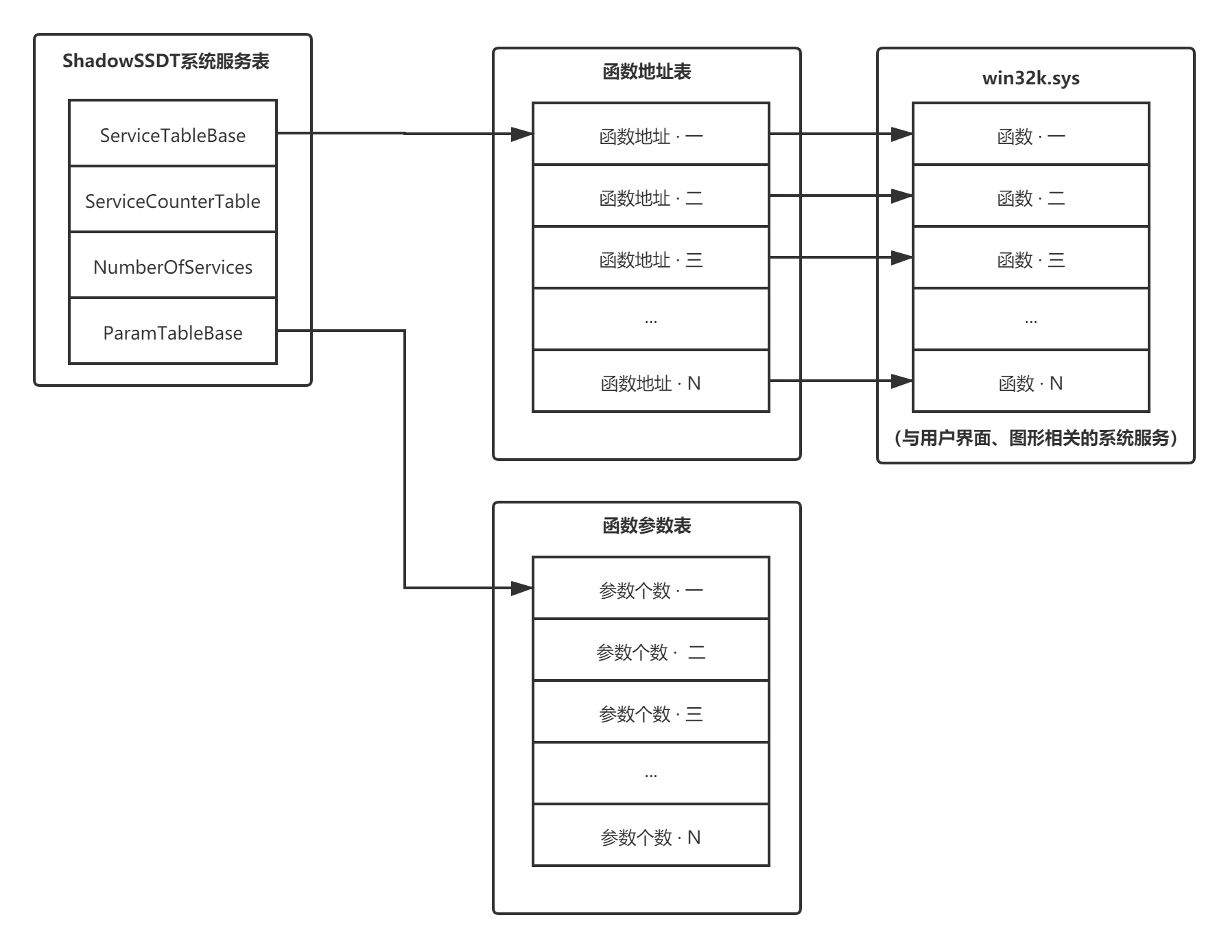 想要进一步了解系统服务调用和SSDT、SSDTShadow之间的过程和联系,可以查阅:https://blog.csdn.net/qq_41988448/article/details/102994374