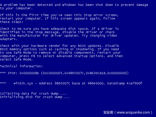}编译成exe丢到Win7 x86虚拟机中执行,由于调用系统服务时产生了模式切换,进入了内核态,在内核态中,对空指针进行操作,进而触发了蓝屏。而在用户模式下对空指针进行操作,只会返回程序错误。