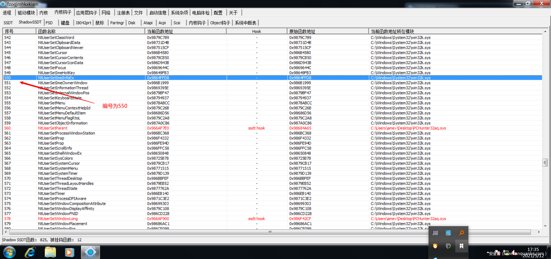 回归正题,我们在Win7 x86的环境下打开PChunter,点击内核钩子-ShadowSSDT,通过翻找可以查阅到我们所需调用的NtUserSetImeInfoEX的编号为550。