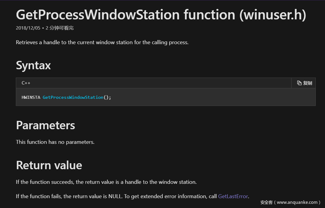 通过查阅MSDN微软开发文档(https://docs.microsoft.com/zh-cn/windows/win32/api/winuser/nf-winuser-getprocesswindowstation),可知GetProcessWindowStation方法返回当前进程的窗口句柄。