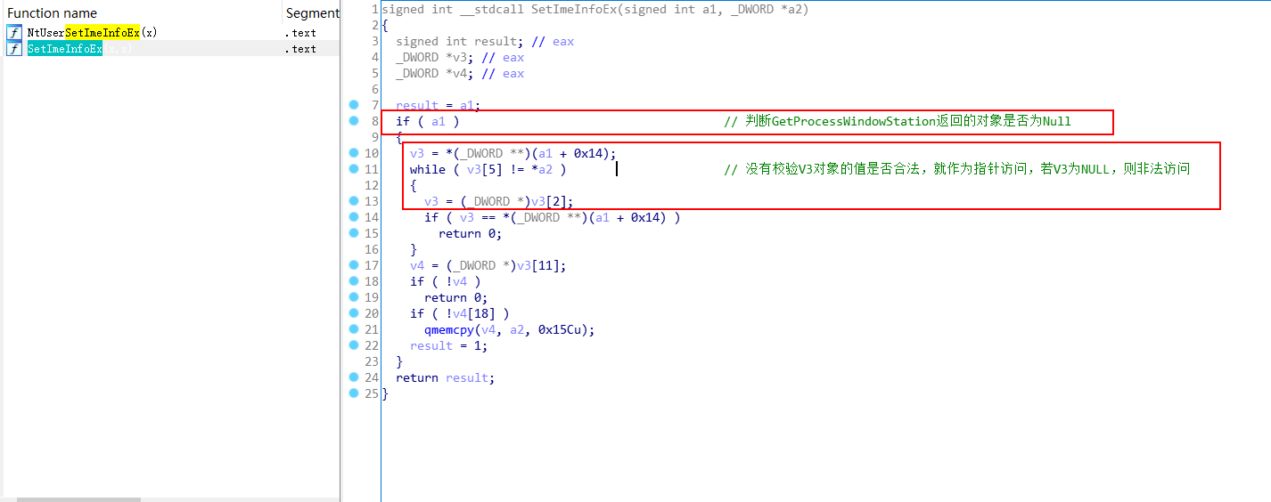 根据披露的信息,我们使用IDA Pro来对win32k.sys组件进行反编译以定位相关的漏洞位置。