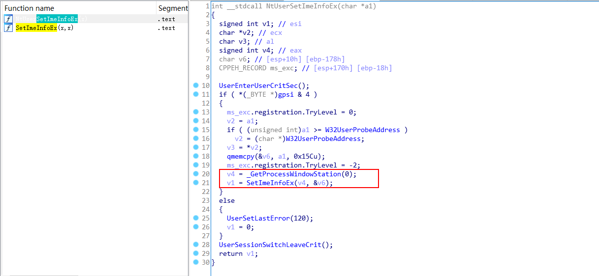 通过查看NtUserSetImeInfoEx函数的伪源代码,可知,传入SetImeInfoEx的第一个参数为 v4 = _GetProcessWindowStation(0);