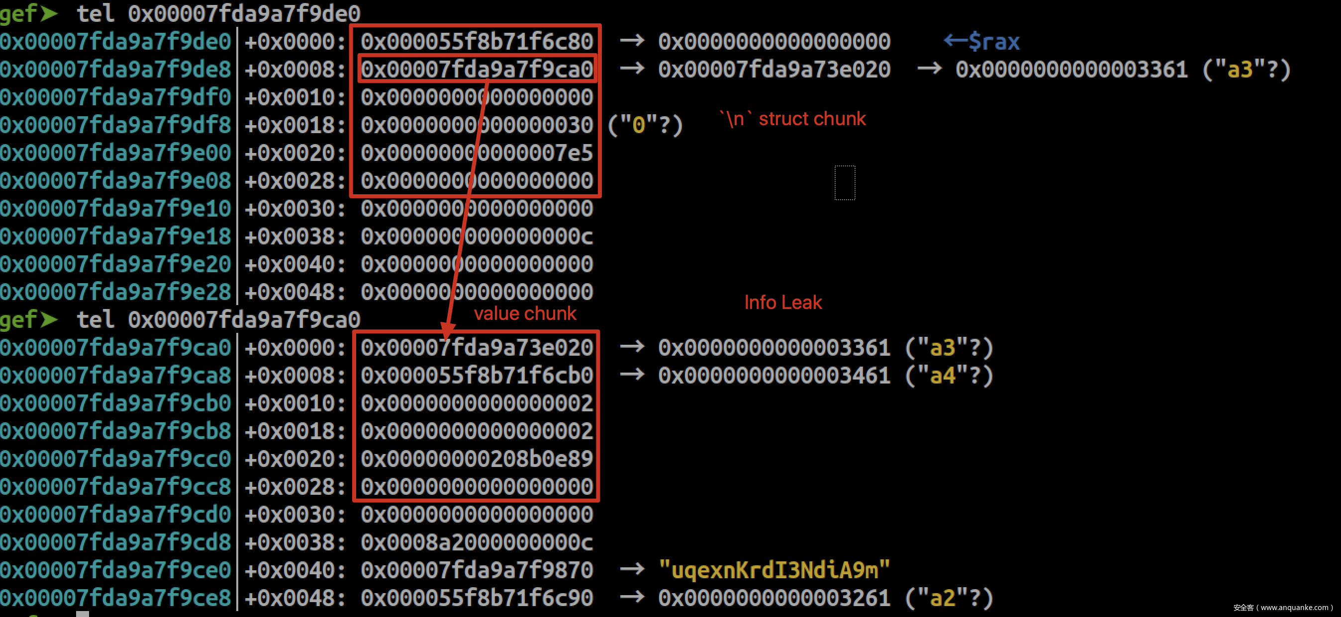 5.这时,这个struct chunk便落在\n struct chunk的value chunk域内,通过query(‘\n’)便可打印出内存信息。