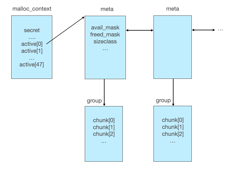 上篇我们大致过了一遍musl libc 1.2.2的mallocng源码,了解到musl堆管理器用以下的结构管理着meta、group以及chunk。本篇我们继续来分析mooosl这道题的解题思路。