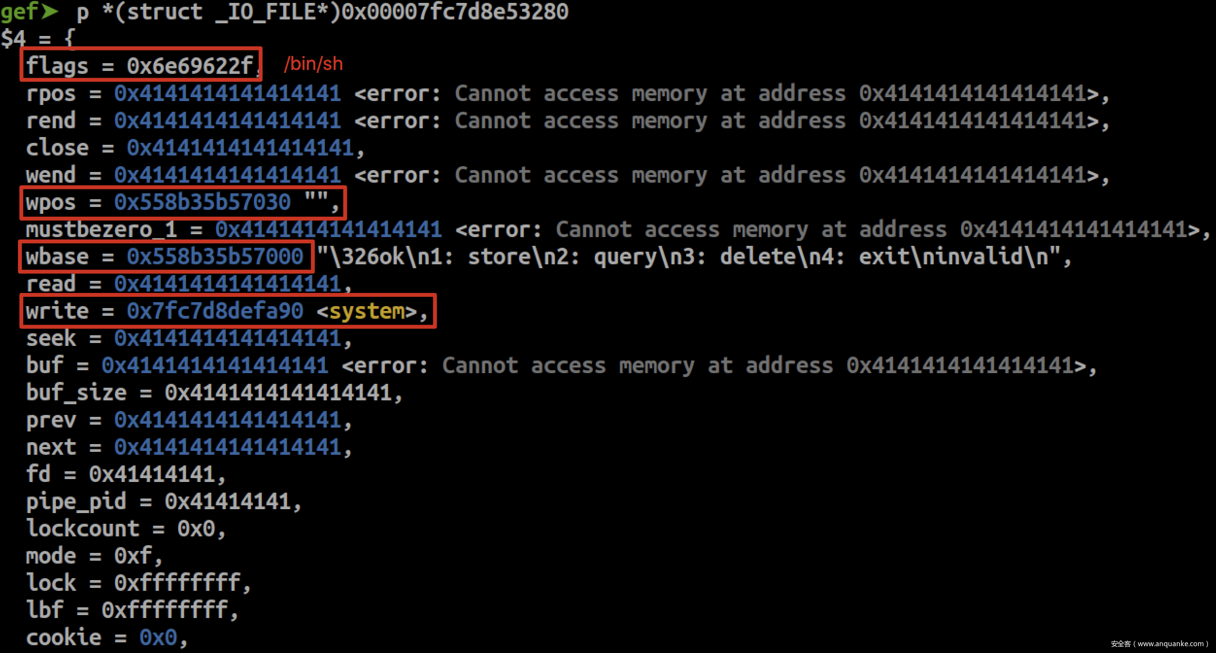 申请size 0x80的chunk,便会将stdout-0x10分配回来。然后覆盖stdout->write函数指针为system,在stdout->flags写入/bin/sh\x00,并且保证stdin->wpos != stdin->wbase