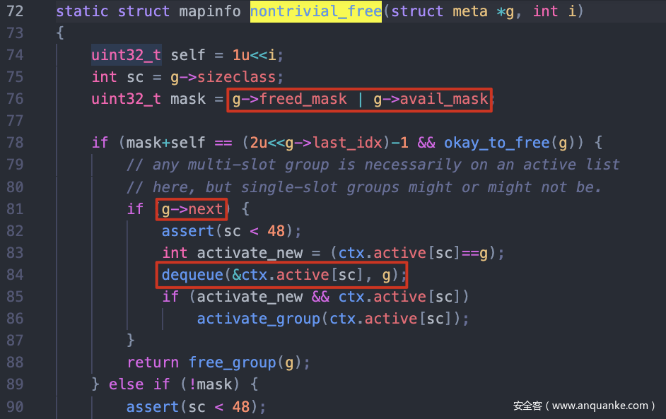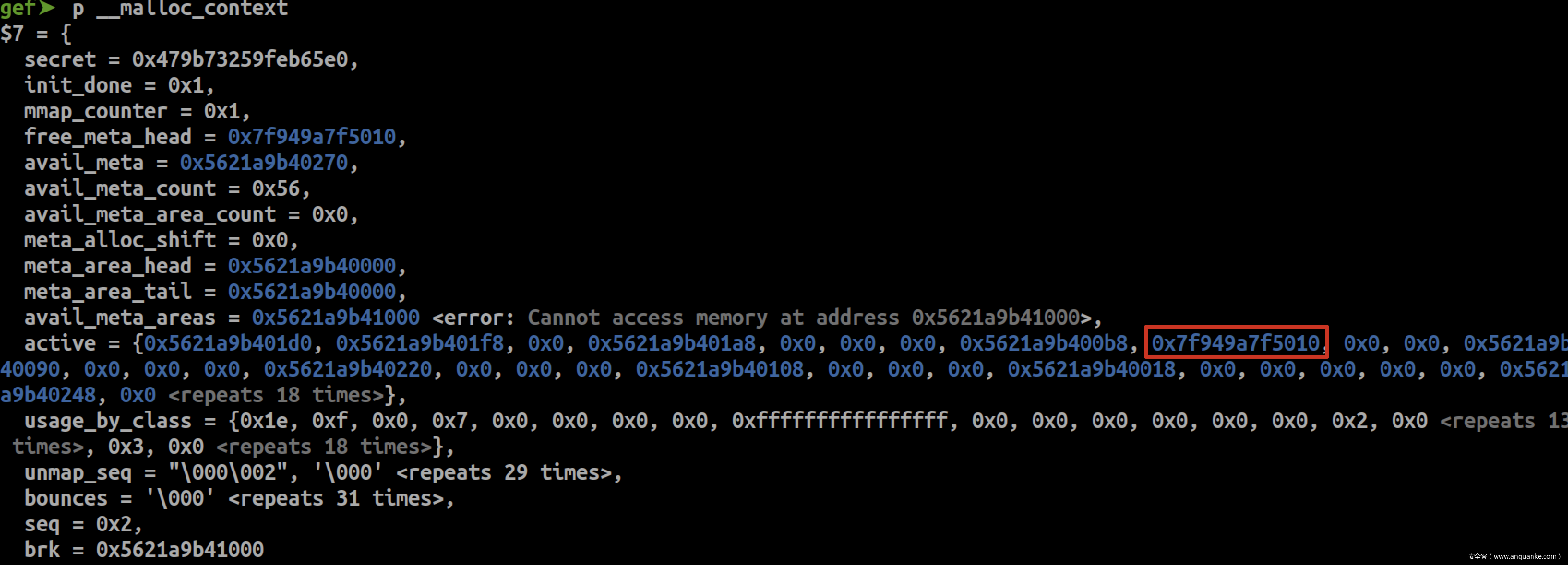 注意到nontrivial_free方法,当g->freed_mask | g->avail_mask为0时,也就是当所有块都在使用中,这时可以引入next meta和group进行块处理。也就是可以引用fake meta,并通过其返回任意地址。