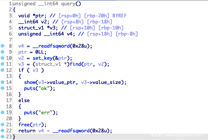 query,查询功能,根据输入的key,找到对应的value并以hex字符串形式输出。注意到这里调了set_key,会先申请chunk用于存放key,最后再free掉。