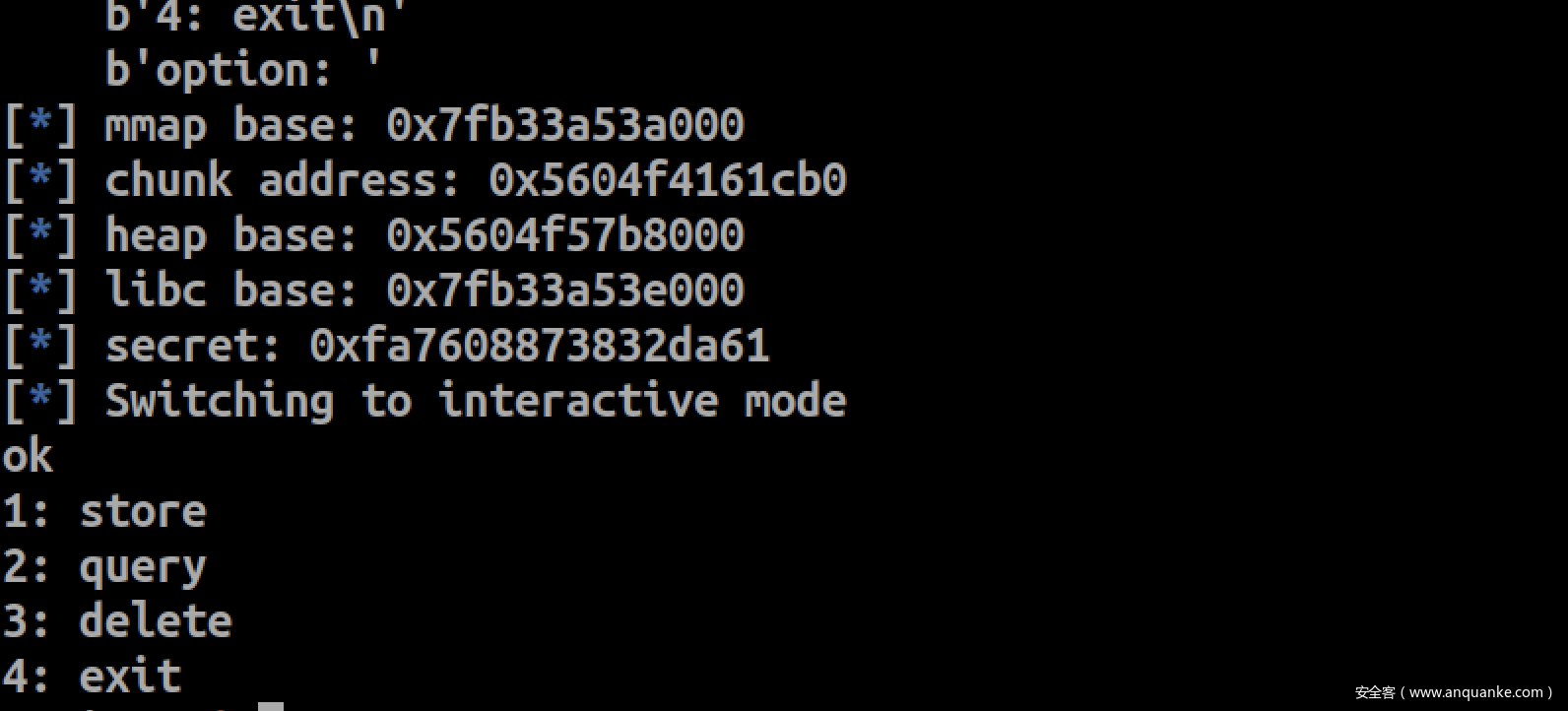 query(p64(0) + p64(heap_base) + p64(0) + p64(0x20) + p64(0x7e5) + p64(0))