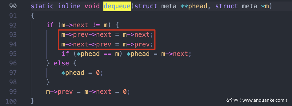 利用meta dequeue方法的unlink漏洞可以达到任意写的效果