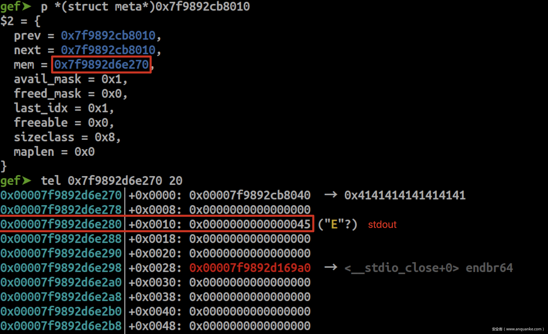 如上,将fake mem放置在fake meta相邻位置,提前布置好avail_mask、freed_mask、last_idx等结构。另外,还需要页对齐,并且页首8个byte需要布置一个page secret数据,绕过meta的check。