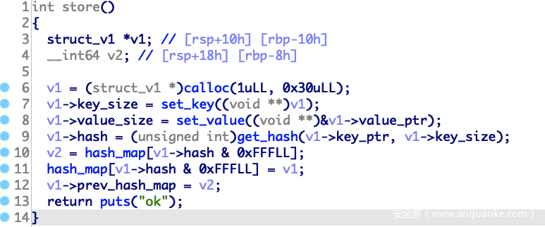 sotre,申请0x30的chunk,用于存放key、value以及对应的size,另外还会算出hash和prev_hash_map(保存着hash_map先前在该处的指针)