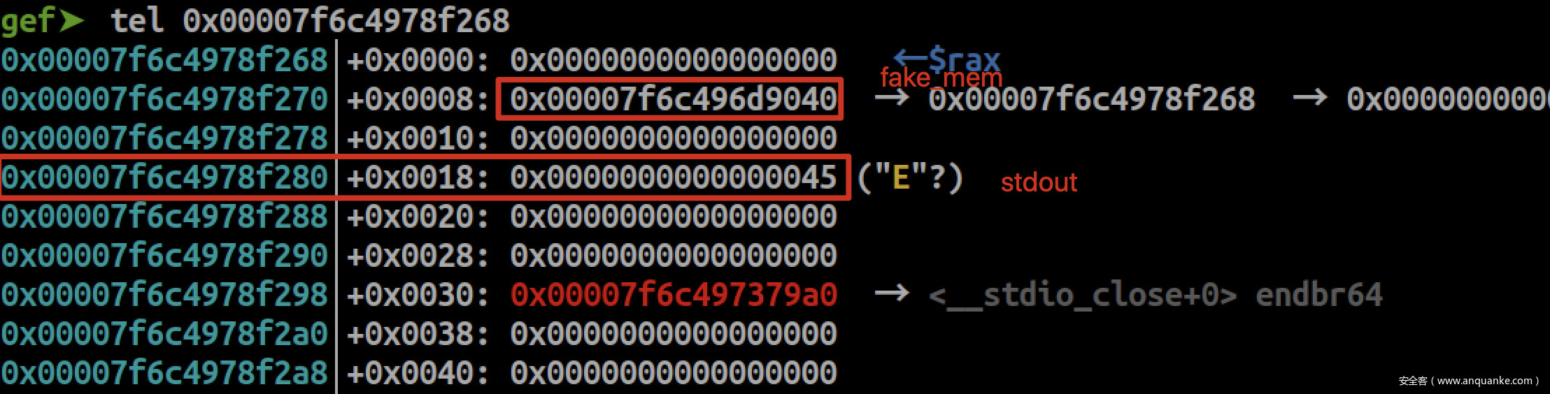 现在可以随意修改fake_meta的fake_mem,令其指向stdout-0x10