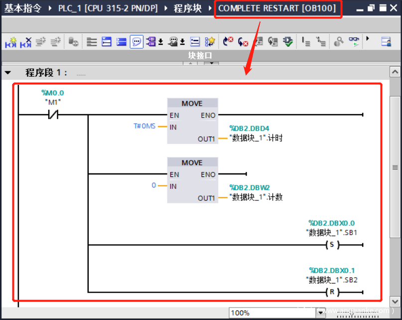 除了数据块初始化,还可以使用“组织块”中的“Startup”来定义,在里面可以编写一些程序在首次扫描时执行。
