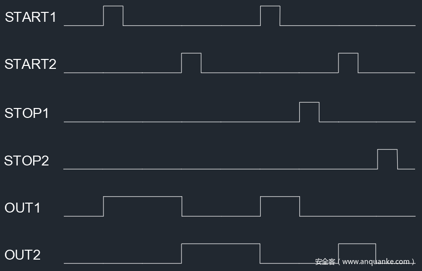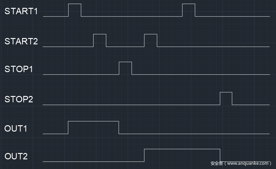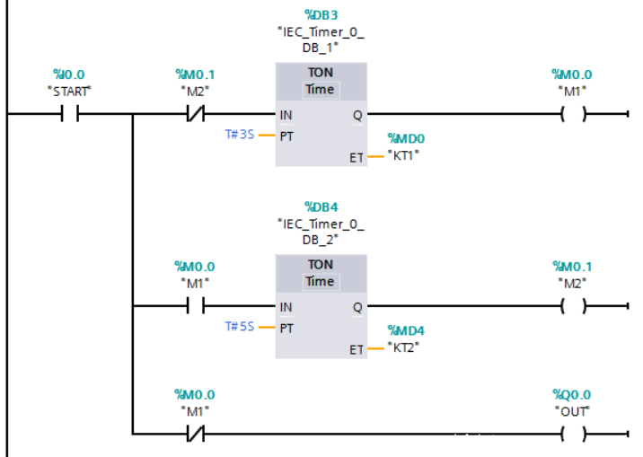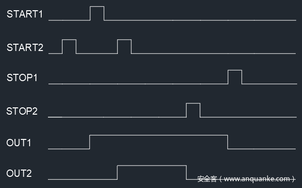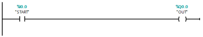 这里START信号为自复位按钮按下的信号,是正信号,STOP是负信号,是互锁信号或促使结果断的信号,OUT是输出动作信号。运行情况,当自复位按钮按下时,START信号为正,回路接通,OUT输出;自复位按钮松开时,START信号为负,回路断开,OUT输出复位。