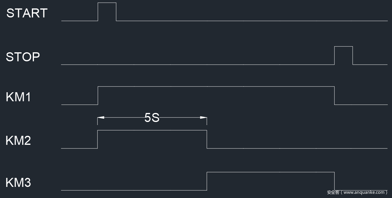 按钮启动按钮,接触器KM1和KM2闭合,星型启动,5秒后,接触器KM2断开,接触器KM1一直得电,同时接触器KM3闭合,三角启动,自动正常运行。