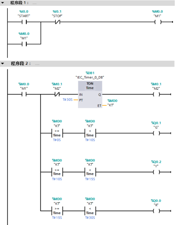 上图为模拟红绿灯控制逻辑程序。当启动按钮START按下,接通延时定时器,10s绿灯、5s黄灯、15s红灯,30s后定时器复位,重新开始计时,不断重复。