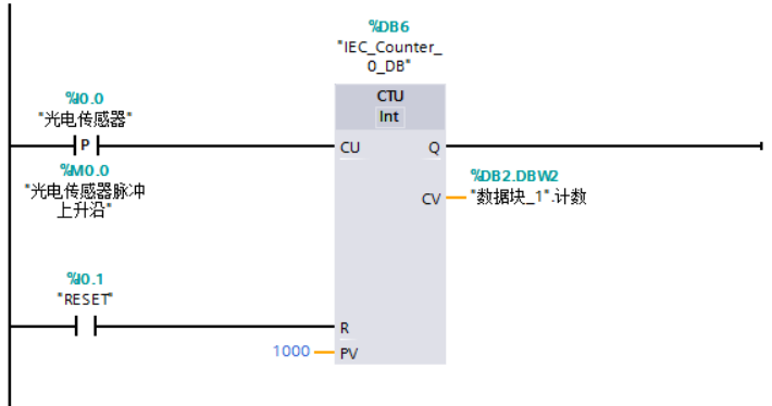 当光电传感器检测到产品经过时,产生一个接通信号(在程序中输出一个脉冲上升沿信号),计数加1,不断有产品经过时,计数累加,直至复位(RESET闭合信号),重新开始计数。