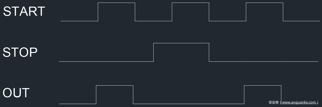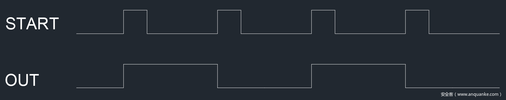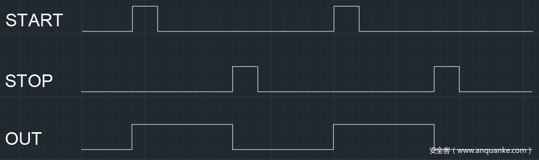 用户有时需要使用一个自复位的按钮(START)来控制机器(OUT)的启停,效果是按一下启动了,再按一下停止,再按启动,再按停止,以此往复。这个控制比单个自锁按钮控制要复杂一些。