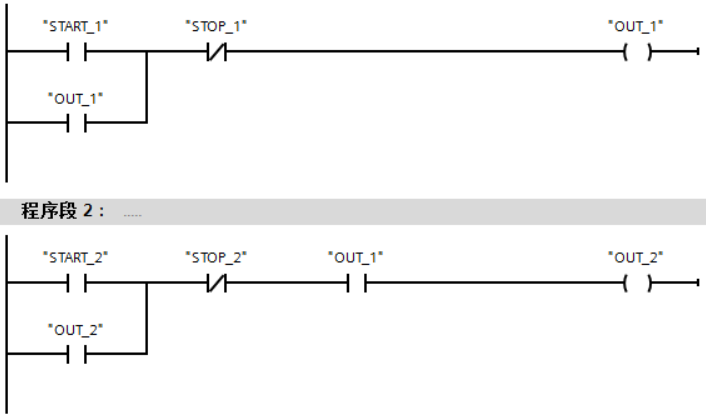 OUT_1的常开触点串在OUT_2的控制回路中,OUT_2的接通是以OUT_1的接通为条件。这样,只有OUT_1Q1接通才允许OUT_2接通。OUT_1关断后OUT_2也被关断停止,而且OUT_1接通条件下,OUT_2可以自行接通和停止。