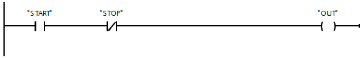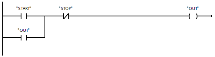 START是启动的脉冲动作信号,STOP是负信号或互锁信号,OUT是输出的持续信号。运行情况:当START发出脉冲动作信号时,回路瞬时接通,OUT输出并自锁,回路持续接通,OUT输出持续信号;需要停止时,STOP发出信号即可断开回路。