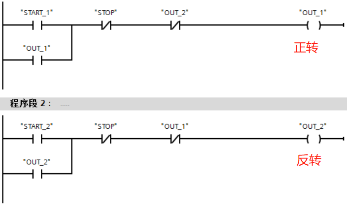 当START_1动作,OUT_1(正转)输出信号,此时,START_2动作,回路中常闭触点OUT_1断开,回路不接通,OUT_2(反转)无输出信号,只有OUT_1断开后,才可以启动OUT_2,反之同理。