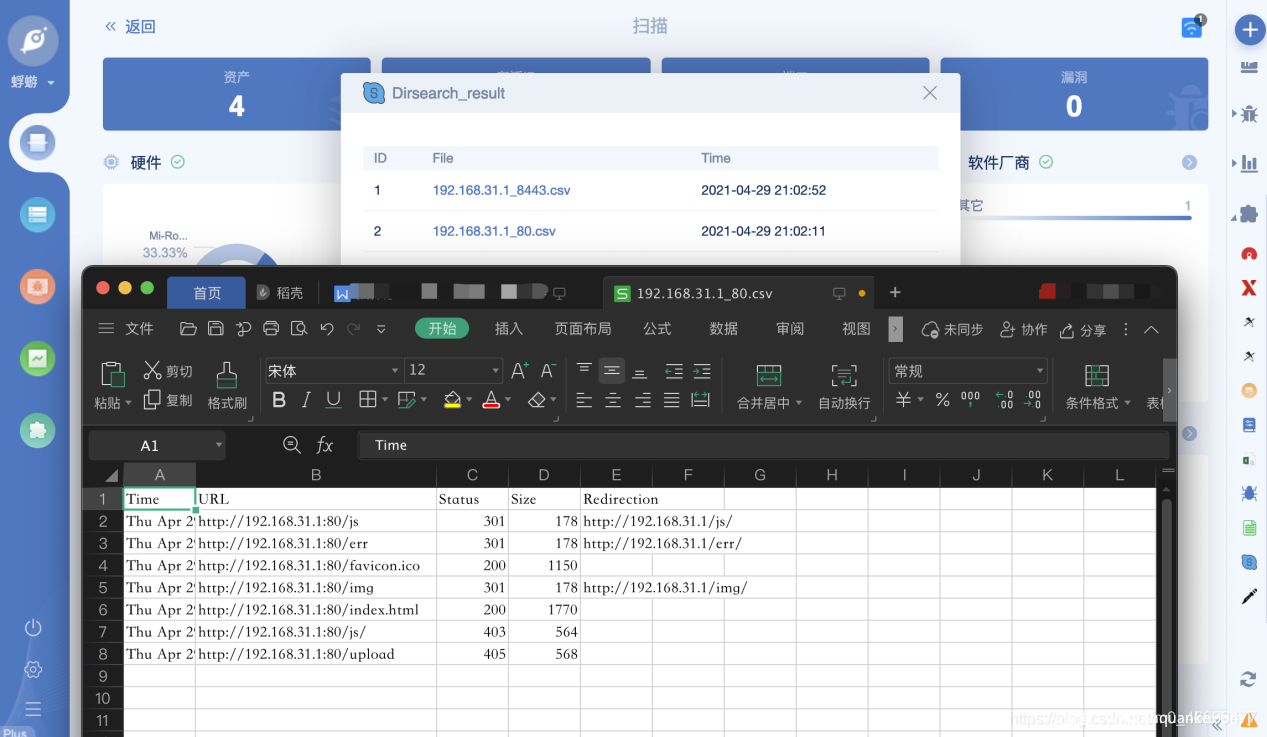 3.ipDetail 按钮、webfinder 按钮不用多说,是用来调用 IP 详情页、webfinder 目录扫描任务的按钮;每次目录扫描都会生成一个 csv 文件用来存储扫描结果;