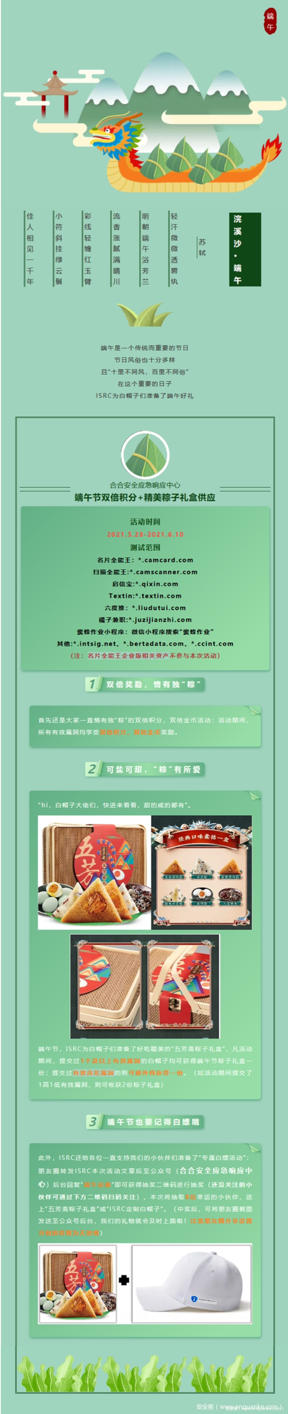 在这个重要的日子,ISRC为白帽子们准备了端午节双倍积分+精美粽子礼盒等端午好礼!