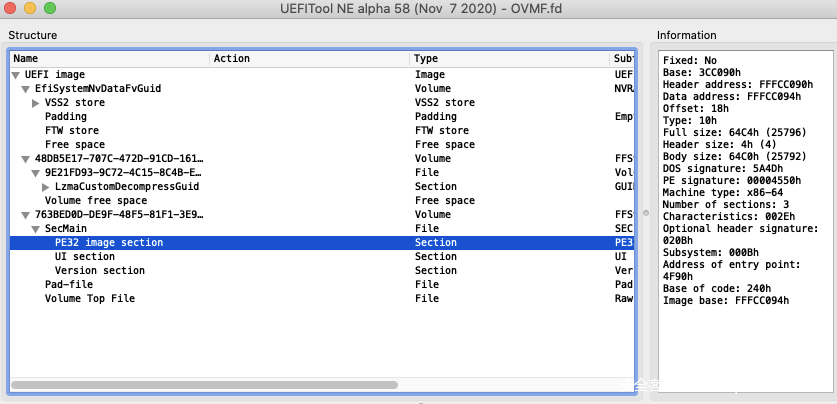 找到一个工具UEFITool能打开OVMF.fd,里面的文件貌似是PE32格式