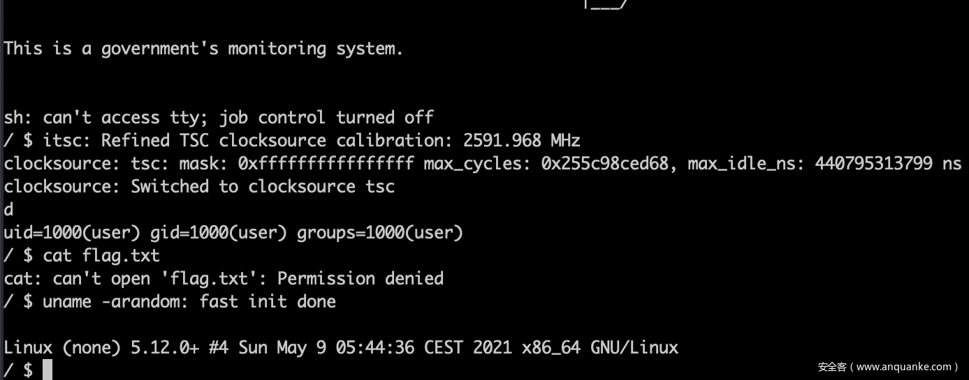 注释掉pow,直接启动。启动起来是一个低权限用户的linux虚拟机,目标是获取根目录下flag.txt的内容,典型的内核题
