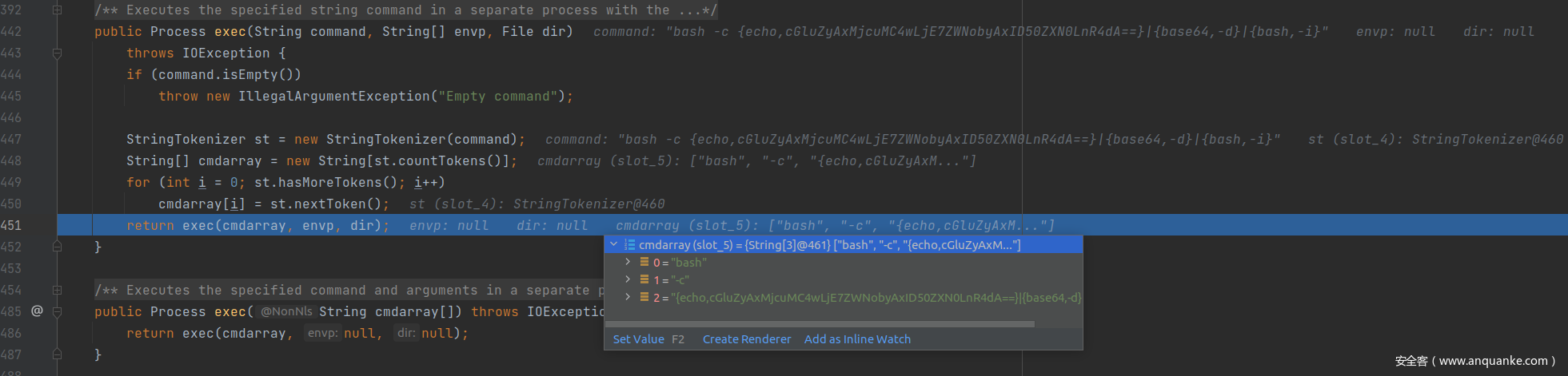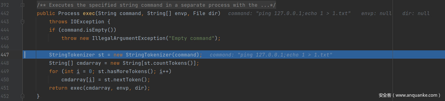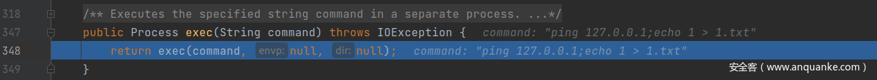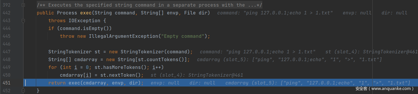 直接通过 Runtime.getRuntime().exec(Command); 没有成功创建 1.txt。通过 Runtime.getRuntime().exec(new String[]{"/bin/sh", "-c", Command}); 成功创建 1.txt。 于是尝试对 Runtime.getRuntime().exec(Command); 进行调试分析。