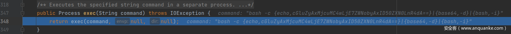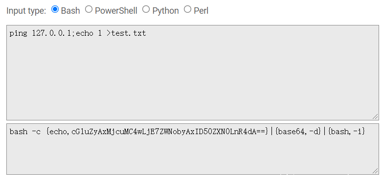 String Command = "bash -c {echo,cGluZyAxMjcuMC4wLjE7ZWNobyAxID50ZXN0LnR4dA==}|{base64,-d}|{bash,-i}";