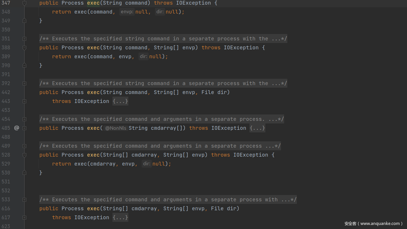 Java 代码审计当中,关于命令执行,我们主要关注的是函数 Runtime.getRuntime().exec(command) && new ProcessBuilder(command).start()